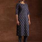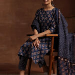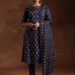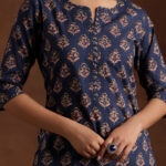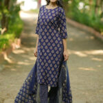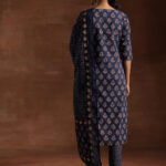 Our 3-piece blue printed cotton suit set features a straight-fit kurta with a notched neckline and three-quarter sleeves. Complemented with palazzo pants with a partially elasticated waistband and roomy pockets, and a dupatta. Highlighted with captivating floral prints and piping-trim accents, this style is perfect for elevated everyday style