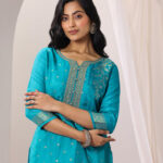 Our 3-piece rama woven design silk blend straight suit set features a straight-fit kurta with a notched neckline, three-quarter sleeves, and a statement yoke. Complemented with solid trousers with an elasticated waistband, and a floral print dupatta. Elevated with ethnic motifs woven design, stylish button accents and thread work, this style is perfect for festive celebrations.
